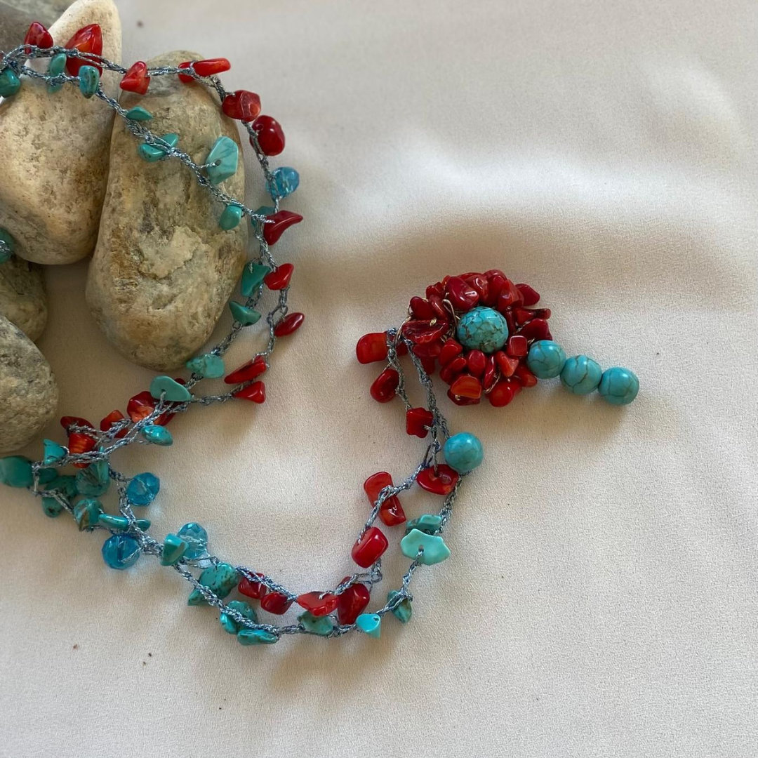 I colori turchese e rosso, ricordano il mare e il corallo, evocando bellezza e l'energia del Mediterraneo, Il turchese simboleggia protezione , serenità e connessione con l'acqua, mentre il corallo rosso rappresenta forza, passione, e vitalità.
